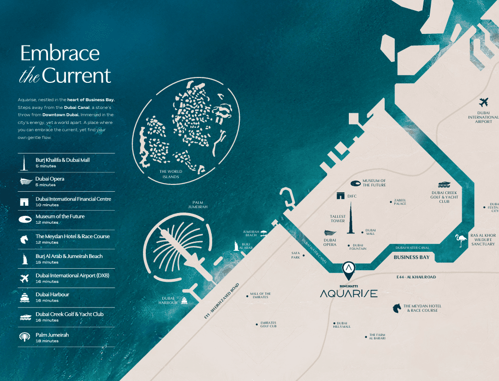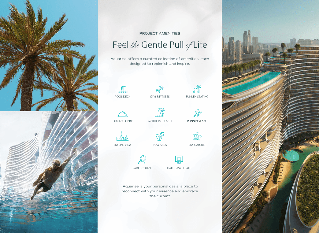 Inspired by the sinuous curves of water, Aquarise façade is a testament to fluidity. A dance of glass and light, reflecting the ever-changing hues of the Dubai sky. An ode to Binghatti’s visionary design,where architecture becomes art.